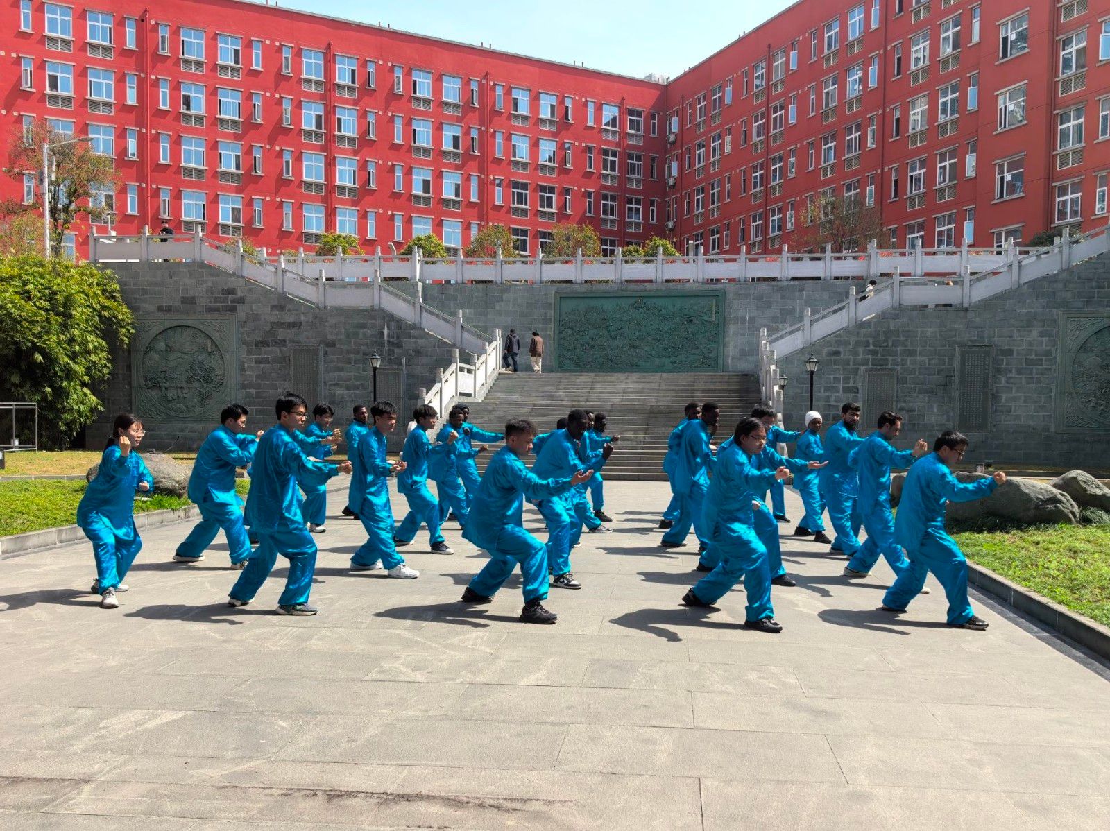 校武术协会成员与国际教育学院15名爱好太极拳的留学生一同身着传统的太极服,现场展演武当九势太极拳,一招一式博得周围观众阵阵称赞,也吸引了部分来往的师生加入方阵一同练习,感受武当太极文化的魅力。武术协会会长尹义成同学表示,太极拳是联合国非物质文化遗产,武当太极文化更是十堰的一张名片,希望通过组织更多的太极拳展演活动让同学们了解太极文化、掀起校园健身热潮。国际教育学院张婷婷老师谈到,武当太极已成为留学生们了解中国文化的一扇窗口,留学生们也从中国文化的学习者逐步成为太极理念的传播者。